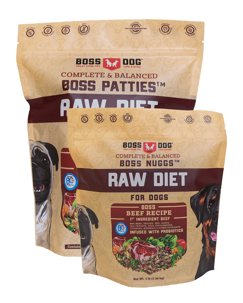 At Boss Dog®, we believe that offering your pet certain raw food products provides them with the foundation for a diet that resembles one akin to the wild. Boss Dog® Raw Frozen BOSS PATTIES™ and BOSS NUGGS™ offers your pet a wholesome and delicious way to benefit from and maintain optimal health. Infused with probiotics, our BOSS NUGGS™ and BOSS PATTIES™ offer a complete and balanced recipe and are formulated to deliver essential nutrition for your pet.