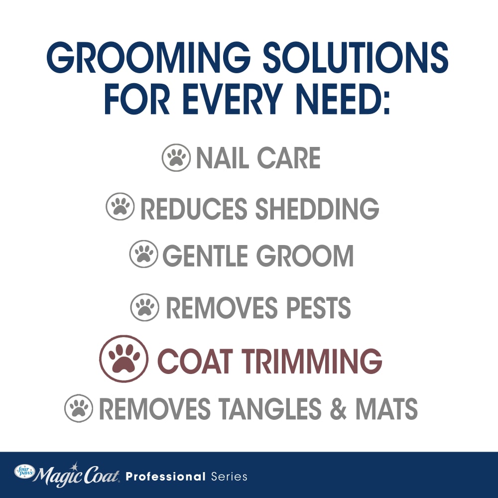 The Magic Coat Professional Series features premium multi-purpose pet grooming tools for a salon-like experience right at home. The All-Purpose Grooming Shears are designed with ergonomic handles for comfortable control and high-quality blades for ultimate precision. The blunt tips on these grooming shears minimize the risk of pinching your dog's skin. Meanwhile, this dog grooming tool features rubber finger grips that offer safe and accurate trimming. Our dog groom shears are ideal for all coat types. Plus, they're perfect for grooming cats!