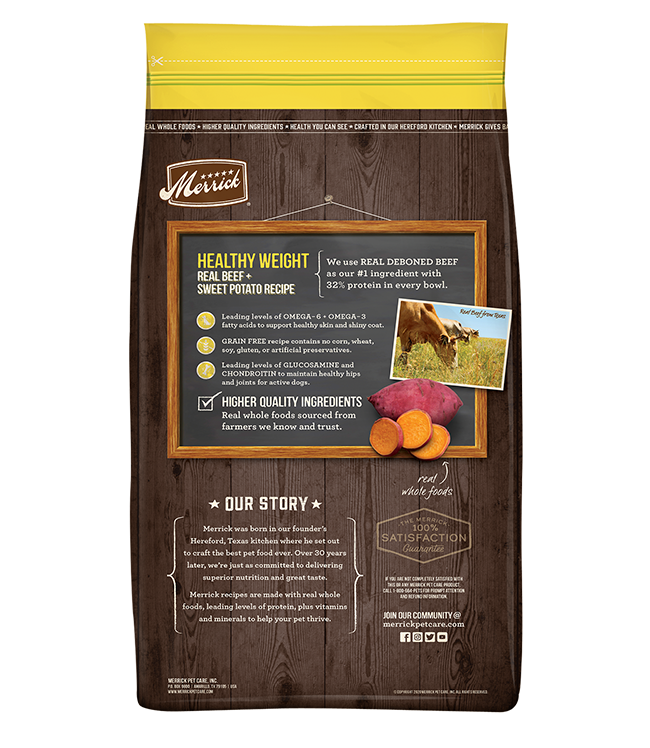 Merrick Grain Free Healthy Weight Recipe Dry Dog Food provides balanced nutrition with real whole foods sourced from local farmers we know and trust. This recipe is specially balanced with 55% beef and poultry proteins and health fat ingredients and 45% fresh produce and vitamins and minerals so dogs get optimal protein and fiber without the extra calories or fat.