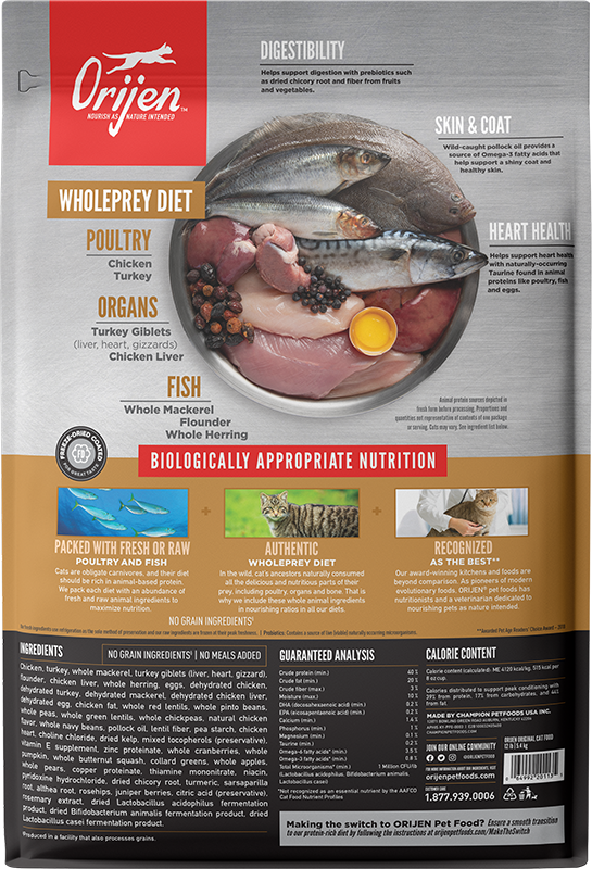 - Our authentic WholePrey diet features the most succulent parts of the prey like poultry or fish, organs and bone to mimic what your cat’s ancestors consumed in the wild.