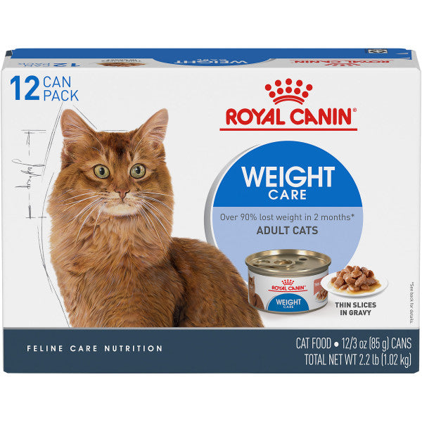 Created with your cat’s weight management in mind, Royal Canin Feline Weight Care Thin Slices in Gravy Canned Adult Wet Cat Food helps slightly overweight cats achieve a healthy weight in a delicious soft, wet formula. With a precise balance of vitamins and minerals, it can help maintain optimal health and wellness. To enhance mealtime palatability, this wet cat food can be paired with Weight Care dry kibble. Over 90% of slightly overweight cats fed Royal Canin Feline Weight Care Thin Slices in Gravy Canned Adult Wet Cat Food lost weight within two months. Royal Canin Feline Weight Care Thin Slices in Gravy Canned Adult Wet Cat Food is formulated for cats with a body condition score of 4, 5, or 6 out of 9, to help support muscle mass and a more ideal body condition. If you need to schedule your cat’s yearly annual exam, you’re concerned that she may have a body condition score of 7 out of 9 or above, or you have any other questions about her health, consult your veterinarian.