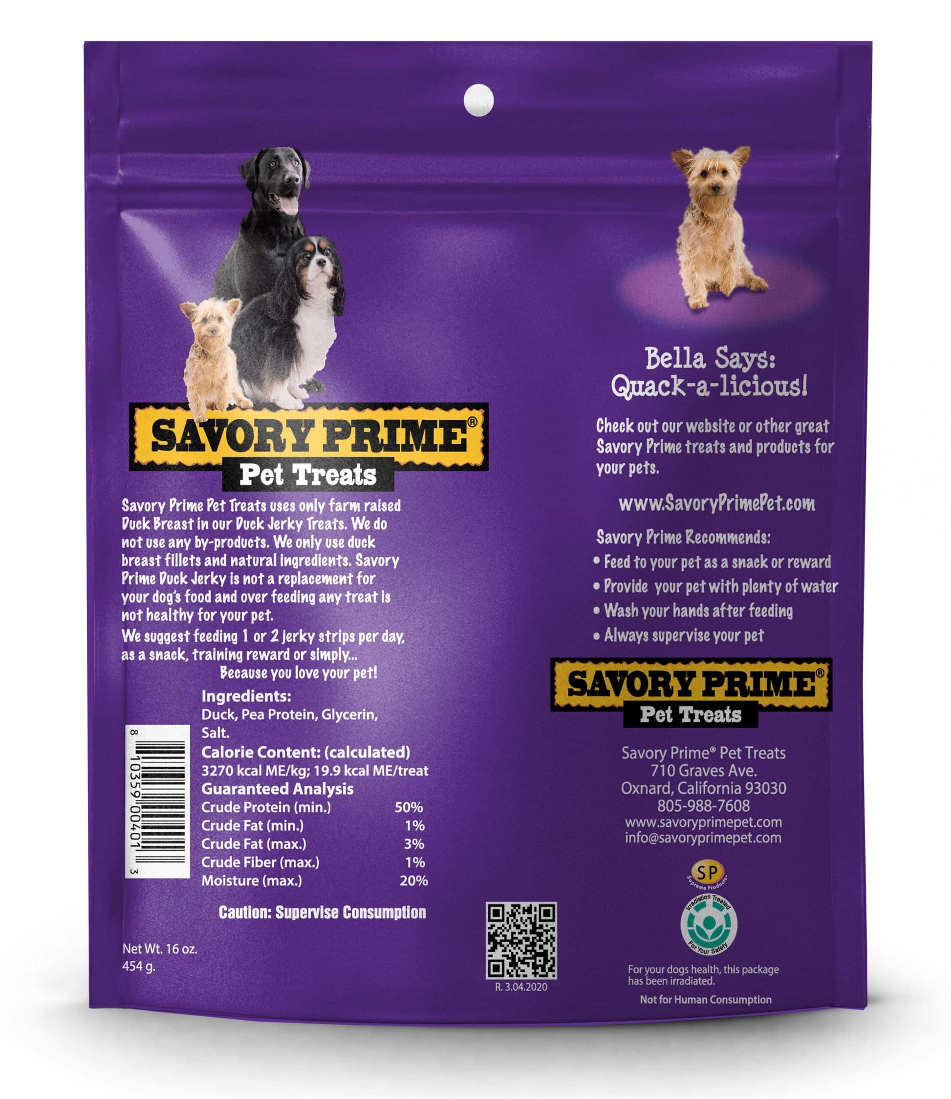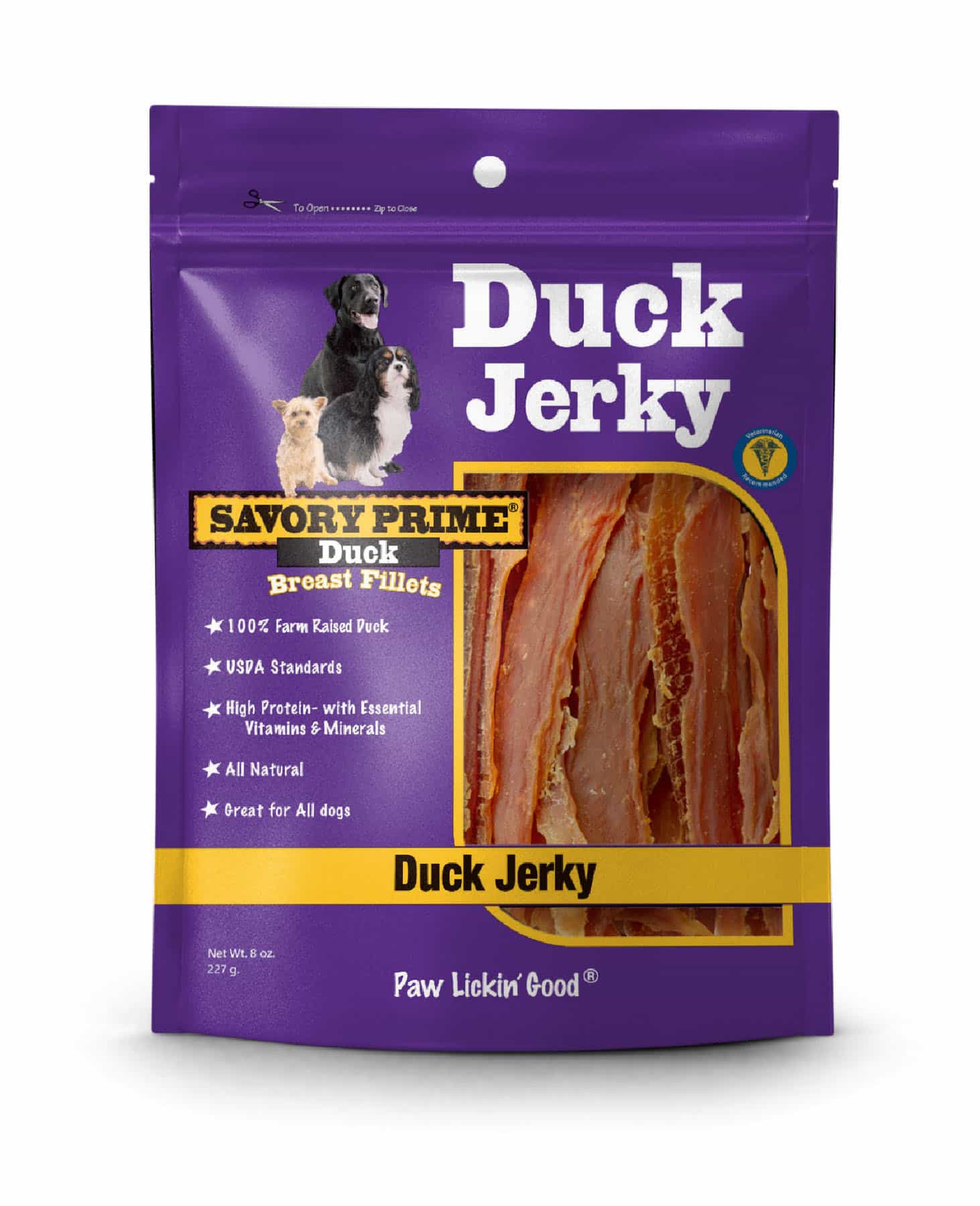 Savory Prime uses 100% high-protein duck breast that is hand sliced for the perfect Duck Jerky treat. A full-flavored taste dogs love. These favorites are an excellent treat, and reward, for all dogs.