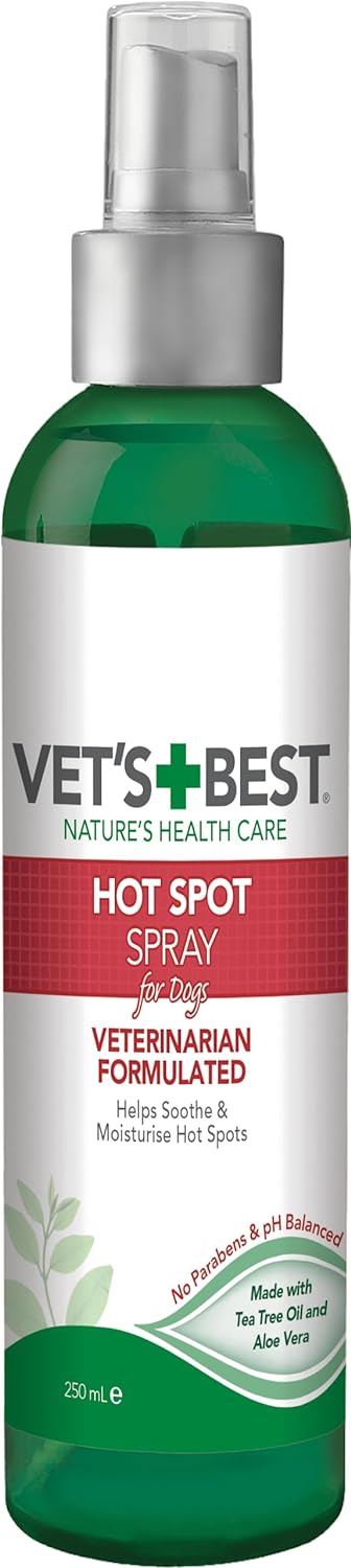 Vet’s Best Hot Spot Spray provides a welcome relief for your dog's itchy, dry, and irritated skin. Our veterinarian-formulated and recommended blend of natural key ingredients, including tea tree oil, aloe vera, and chamomile, provides fast relief for your dog’s itching and scratching. The alcohol-free, no-sting formula is a soothing solution for hot spots as well as seasonal allergies and environmental irritants.