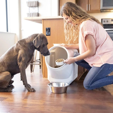 Did you know that storing your pet's food in the bag causes it to go stale and lose its flavor and crunch? Your pet may eat food from the bottom of the bag at a slower pace or may just refuse to eat it at all. Protect your investment and store your pet's food in a Vittles Vault™ Outback Stackable Food Storage Container. An ideal airtight food storage solution, the Vittles Vault Outback Containers locks freshness in while keeping pest and harmful moisture out with its patented Gamma Seal™ Technology. A simple spin of the lid extends the life of your pet's food and keeps it fresher longer while maintaining its nutritional integrity. Engineered with durability and strength in mind, the Vittles Vault Outback Stackable is made of heavy-duty, food-safe BPA-free plastic that won't shatter or crack if dropped and is durable enough to be stored outdoors. A wide front load opening makes it easy to access your pet's food.