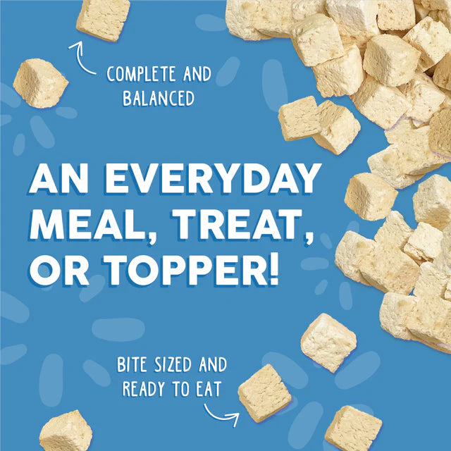 Gently cooked with 96% boneless, skinless chicken breast, our bone-free, fully cooked freeze dried is bursting with flavor your dog will love. Bite-sized and ready to eat, our gently cooked cubes make mealtime effortless and irresistible while providing safe, worry-free handling and trusted nutrition.
